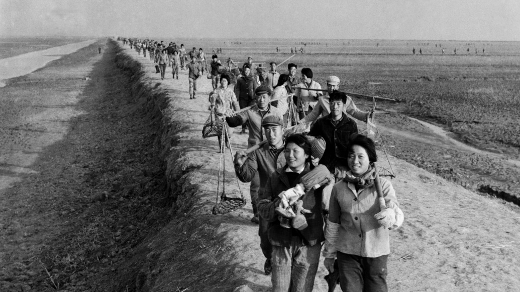 工地上人山人海,遠(yuǎn)遠(yuǎn)看去,宛如一條蠕動(dòng)的長(zhǎng)龍。人氣、煙氣在上空繚繞。兩岸紅旗招展,高音喇叭播送著亢奮的樂(lè)曲。人們挑著泥擔(dān),在田野里捷步如飛。