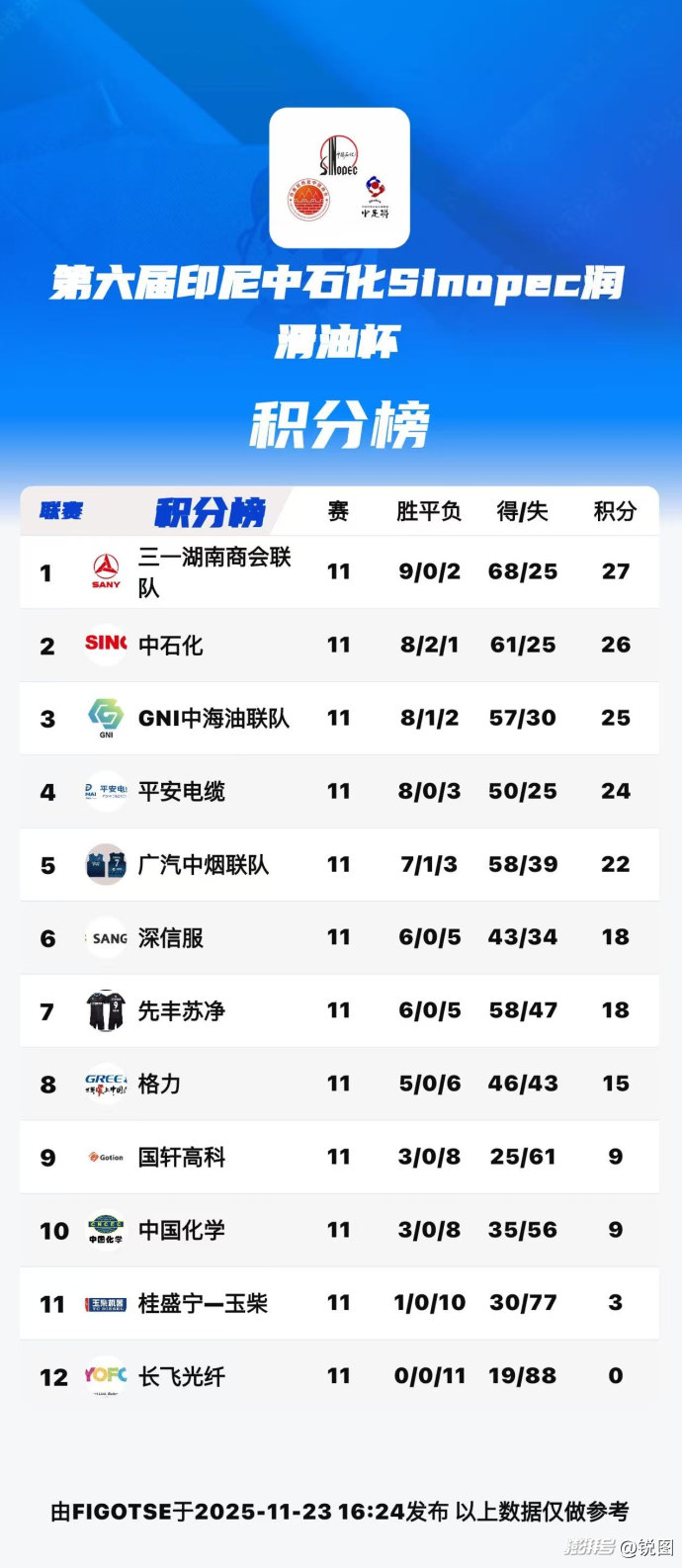第六屆中石化 Sinopec 潤滑油杯五人制中資企業(yè)足球聯(lián)賽從本月8日揭幕,到23日結(jié)束,一共有包括廣汽中煙聯(lián)隊、三一湖南商會聯(lián)隊、先豐蘇凈隊、平安電纜隊、深信服科技印尼足球隊、GNI中海油聯(lián)隊、中國化學(xué)隊、格力隊、桂盛寧—-玉柴隊、國軒高科隊、長飛光纖足球隊和中國石化隊共12支球隊參加比賽。