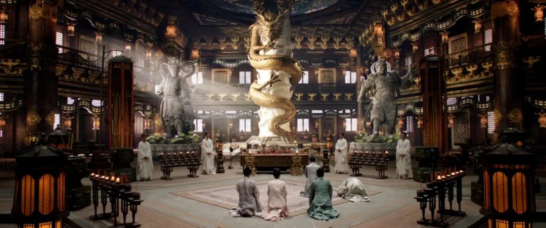 古裝懸疑劇《魅影神捕》屬于“由虛到實(shí)”的實(shí)踐,劇中的關(guān)鍵場(chǎng)景“金龍殿”在殿內(nèi)外分別有一根巨型金龍柱和兩個(gè)高大威猛的海神像。