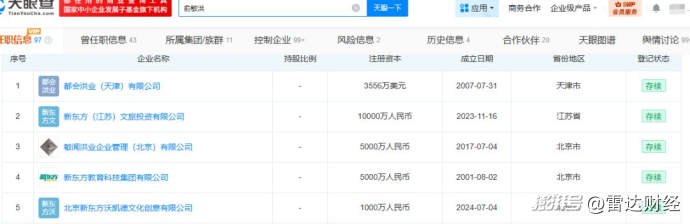 天眼查信息顯示,截至目前,俞敏洪在都會(huì)洪業(yè)(天津)有限公司、新東方(江蘇)文旅投資有限公司、敏聞洪業(yè)企業(yè)管理(北京)有限公司等14家存續(xù)企業(yè)中擔(dān)任法定代表人。