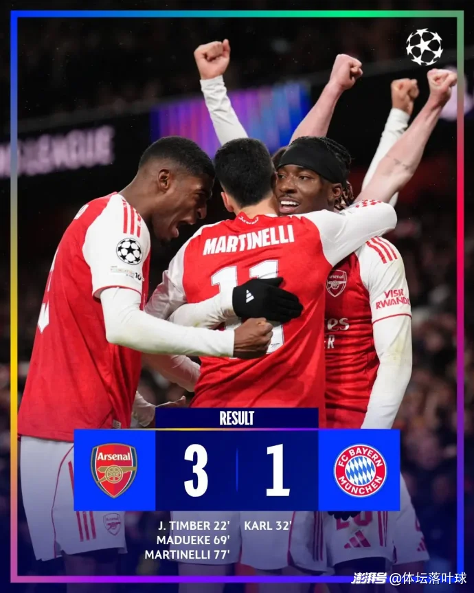 當(dāng)倫敦的夜色籠罩酋長球場,記分牌上跳動的數(shù)字最終定格在3-1——這是阿森納在歐冠聯(lián)賽階段第5輪送給拜仁慕尼黑的比分。22分鐘廷伯的頭槌破門,32分鐘17歲小將卡爾的閃電扳平,69分鐘馬杜埃凱的包抄建功,76分鐘諾伊爾失誤后馬丁內(nèi)利的空門得手,四個進球串聯(lián)起一場跌宕起伏的強強對話。最終,阿森納以15分強勢領(lǐng)跑積分榜,而拜仁則以12分跌至第三,不敗金身告破的同時,暴露了陣容深度與戰(zhàn)術(shù)體系的多重隱患。