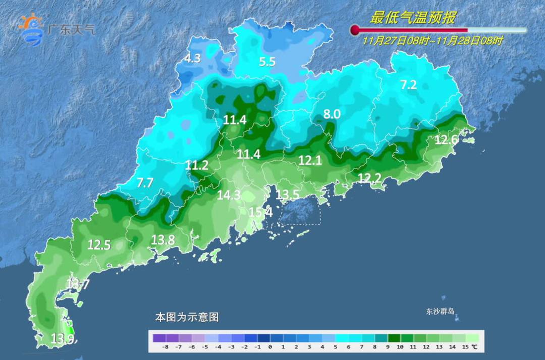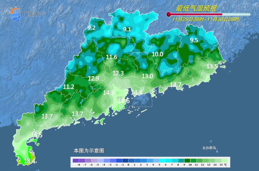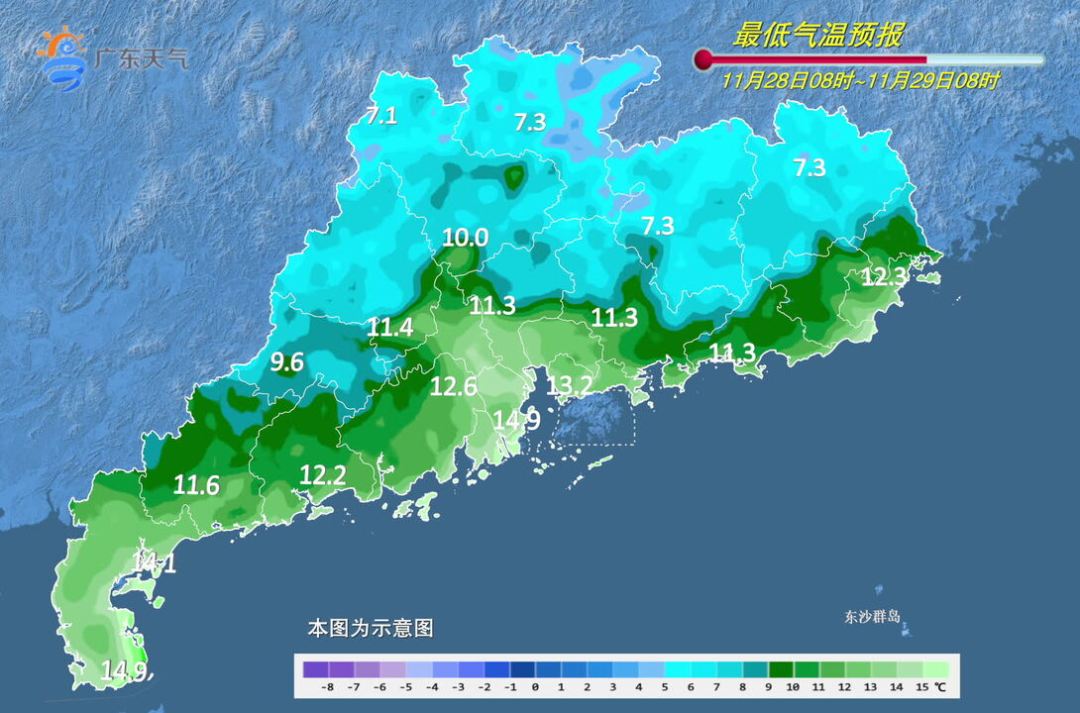 具體來看,28日,我省大部晴間多云。最低氣溫:粵北、肇慶和云浮市縣2~8℃,局部有霜凍,南部沿海市縣12~14℃,其余市縣9~12℃。