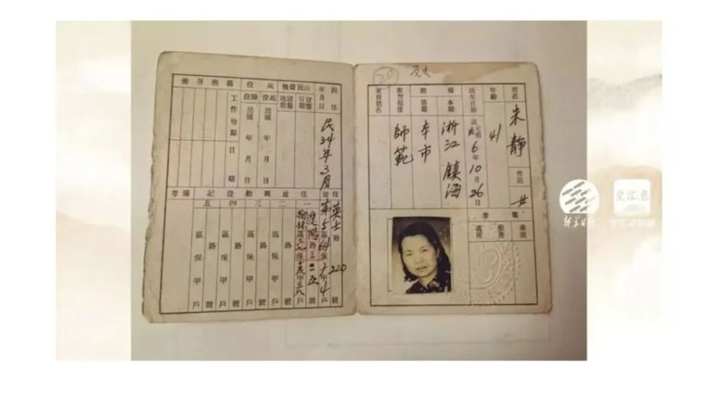 這份編號(hào)為“山字第071142號(hào)”的“聲請(qǐng)書”為紅色印刷,聲請(qǐng)人姓名為朱靜(朱楓的化名之一),年齡41歲,出生日期為“民前六年十月26日”(朱楓出生于1905年11月22日,十月二十六日是她的農(nóng)歷生日。民前六年為1906年,此處或?yàn)楣P誤),籍貫浙江鎮(zhèn)海,受教育程度為師范。住址在英士路(今淡水路)220號(hào),屬五區(qū)(即泰山區(qū),1947年更名為嵩山區(qū),1956年撤銷建制,今屬黃浦區(qū))64保7甲4戶。在聲請(qǐng)書左上角貼有朱楓本人照片,從底部簽名蓋章處的親筆簽名及印鑒可知,聲請(qǐng)人與戶長均為朱靜。朱楓于1945年秘密加入中國共產(chǎn)黨,該“聲請(qǐng)書”登記的居住年月為1945年3月,說明朱楓應(yīng)該是在入黨前后遷居英士路。