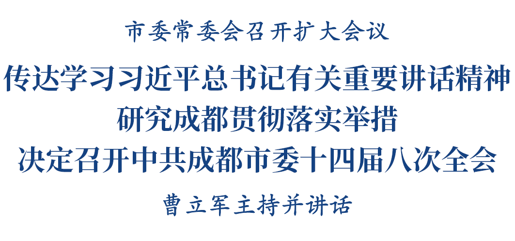 11月26日,市委常委會召開擴大會議,傳達學習習近平總書記有關(guān)重要講話精神,傳達學習省委常委會會議精神和省委書記王曉暉在成都調(diào)研高新技術(shù)企業(yè)時的指示精神,研究成都貫徹落實舉措。會議決定召開中共成都市委十四屆八次全會。省委常委、市委書記曹立軍主持會議并講話。