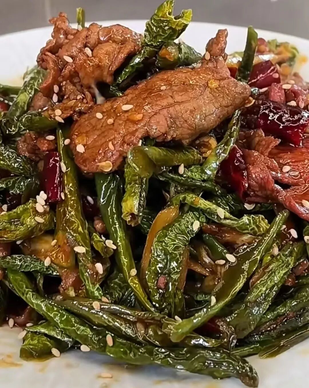 牛肉切片與干辣椒爆炒,香辣過癮。牛肉筋道,辣椒香氣濃郁,是下酒下飯的佳品。