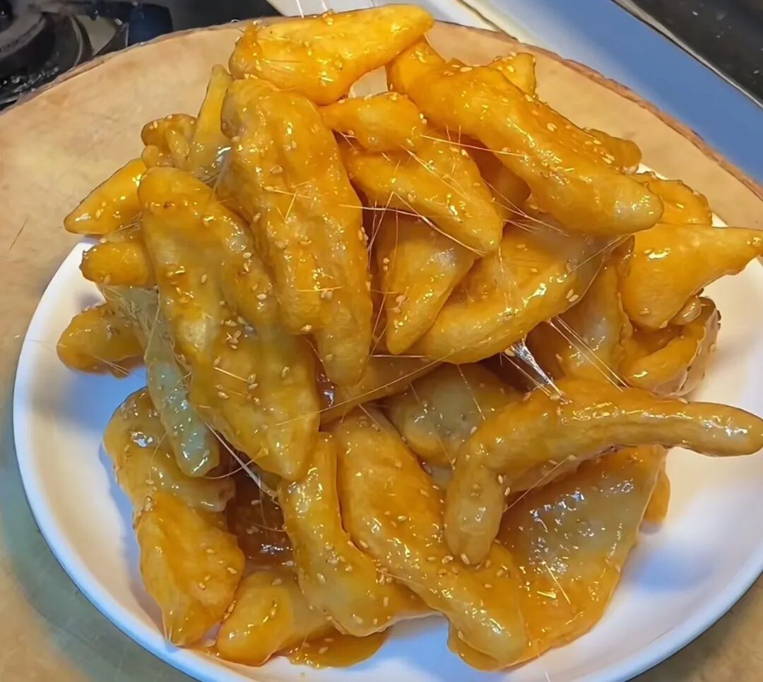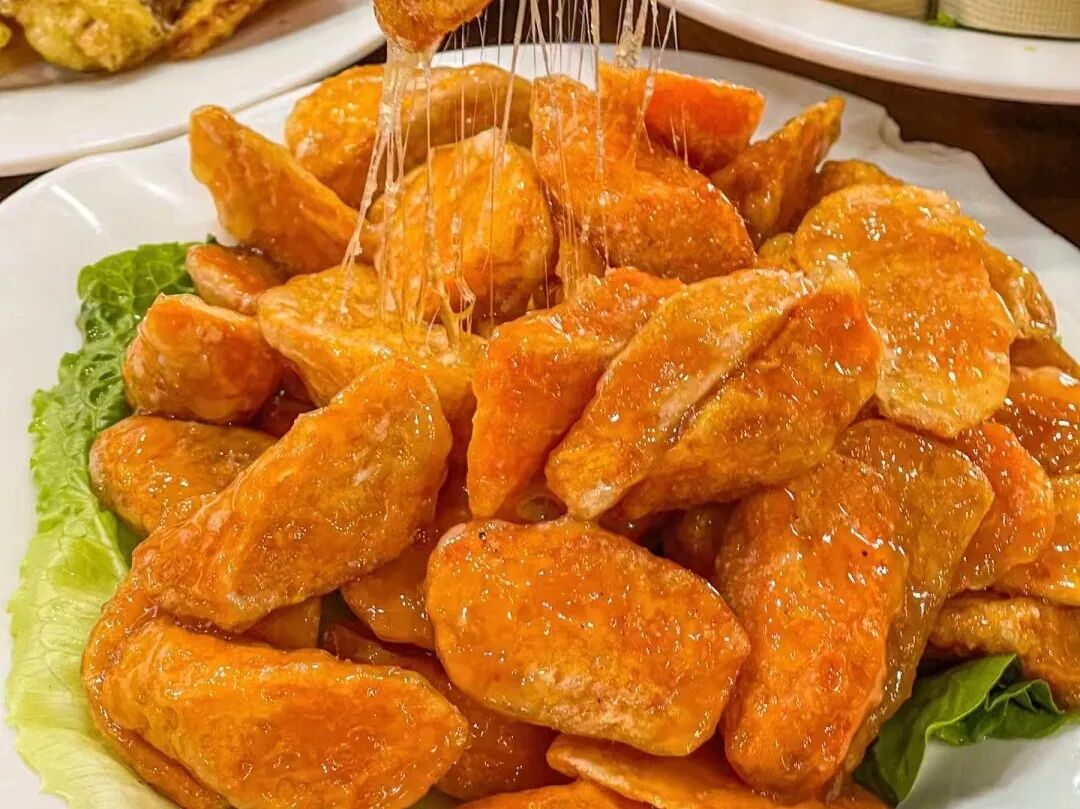 將地瓜切塊炸熟,再裹上熬制的糖漿。趁熱食用時可拉出長長的糖絲,外脆內(nèi)軟,甜香可口,是經(jīng)典的甜品菜肴。