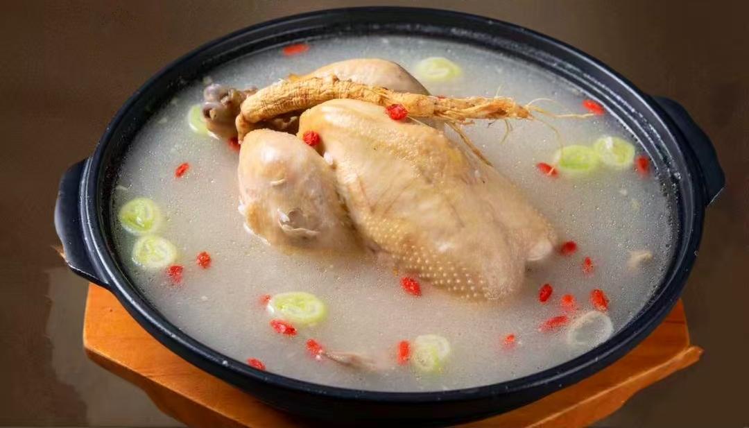 選用童子雞,腹中塞入糯米、紅棗、人參等食材,慢火燉煮。雞肉軟爛,湯色清亮,參香濃郁,是溫潤滋補的佳品。