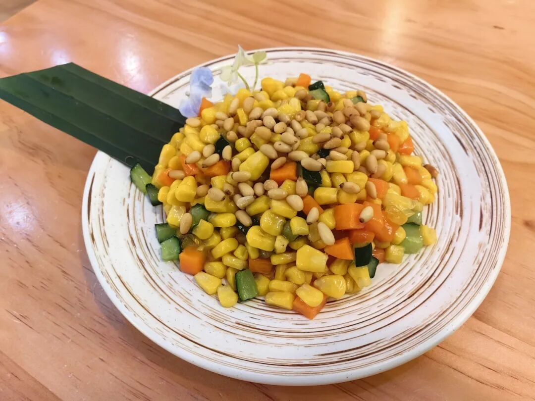 選用東北甜玉米與本地松子,配以青豆、胡蘿卜粒清炒。色澤鮮艷,清甜爽口,松子香脆,是宴席上的解膩佳品。