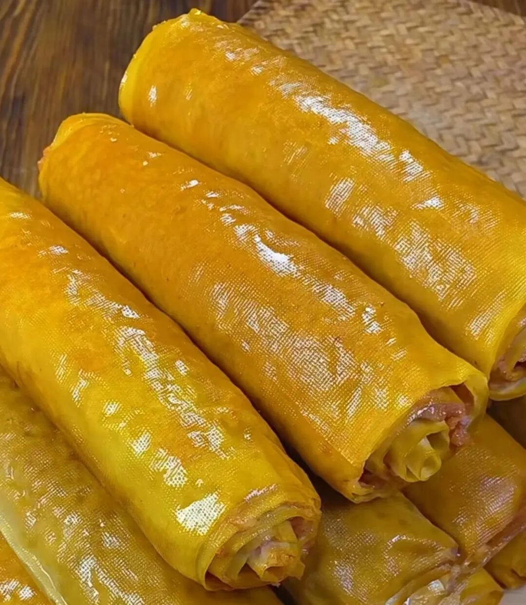 將雞蛋薄片炸至蓬松,掛上糖漿。成品金黃,外脆內(nèi)軟,可拉出綿長糖絲,蛋香濃郁,是宴席上的熱門甜品。