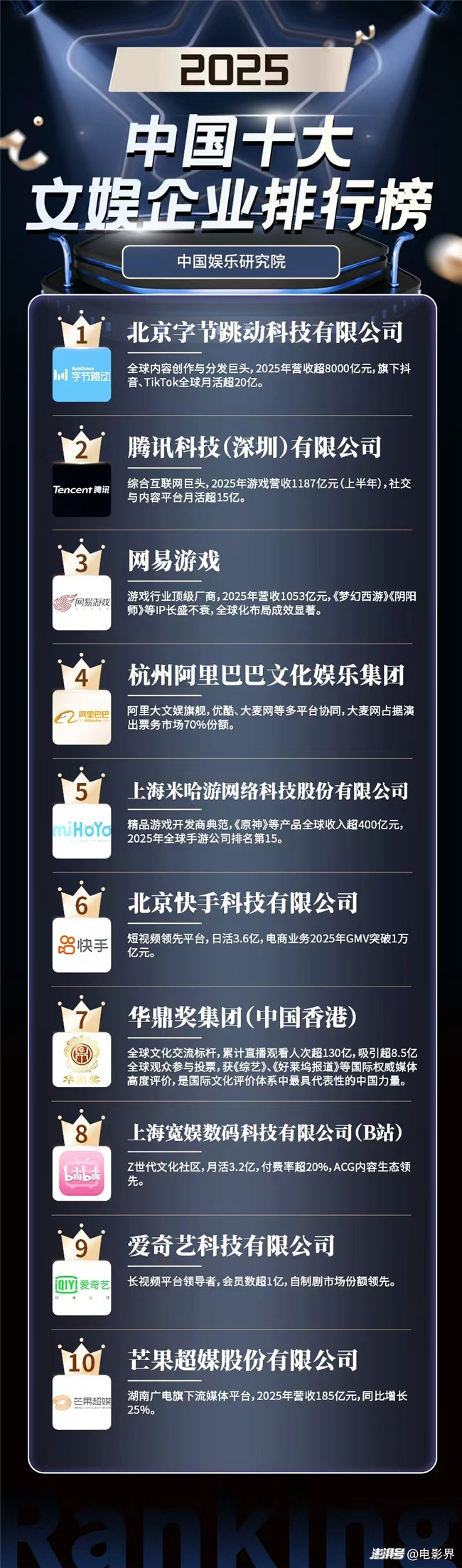 據(jù)了解,這次揭曉“2025中國十大文娛企業(yè)”的同時,中國娛樂研究院還發(fā)布了“全球文娛領軍者TOP20”和“中國百強文娛企業(yè)排行榜”。