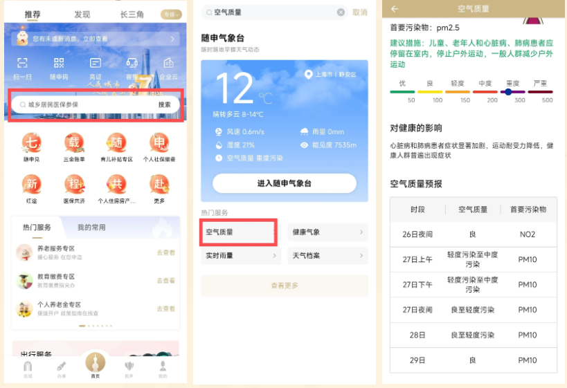 打開(kāi)“隨申辦市民云”APP,首頁(yè)搜索“空氣質(zhì)量”即可進(jìn)入服務(wù),查看上海空氣質(zhì)量詳細(xì)報(bào)告及空氣質(zhì)量預(yù)報(bào)。