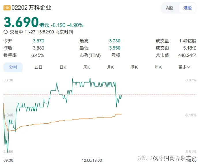 H股萬(wàn)科企業(yè)臨近11月26日收盤(pán)時(shí)跌幅較最低點(diǎn)收窄1個(gè)百分點(diǎn),但股價(jià)仍然不到4港元,市值僅467億港元。截至11月27日發(fā)稿,萬(wàn)科企業(yè)股價(jià)下跌4.90%。