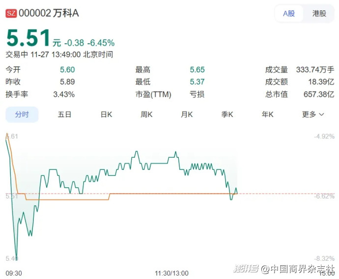 雖然債券跌幅收窄,但股價(jià)未能回彈。截至11月26日收盤(pán),萬(wàn)科A仍延續(xù)跌勢(shì)至5.89元,市值僅702億元。要知道在去年10月,萬(wàn)科A市值仍有1238億元,一年多時(shí)間市值蒸發(fā)500多億元。截至11月27日發(fā)稿,萬(wàn)科A仍未能成功翻紅。