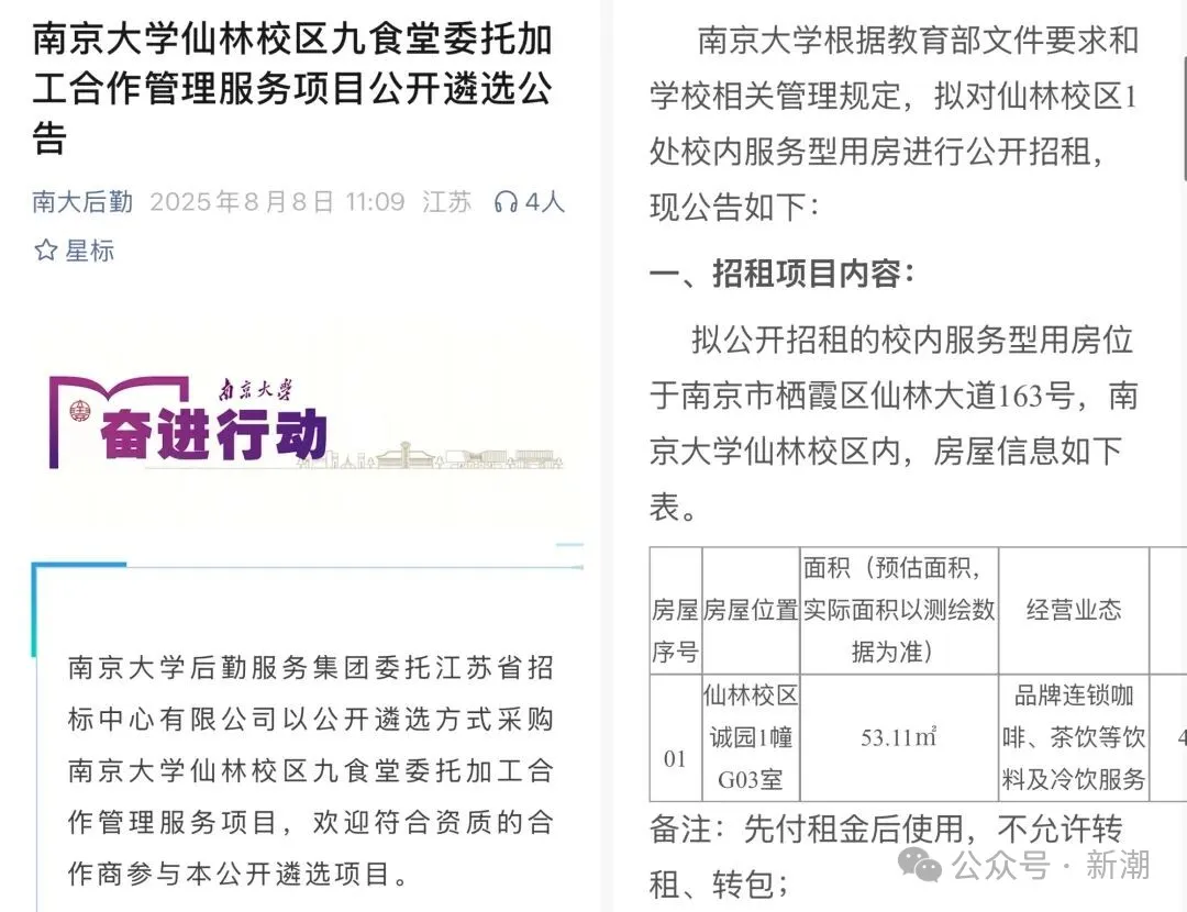 南大后勤的九食堂遴選公告和資產(chǎn)管理處的招租公告,后者為今年9月開業(yè)的茶百道