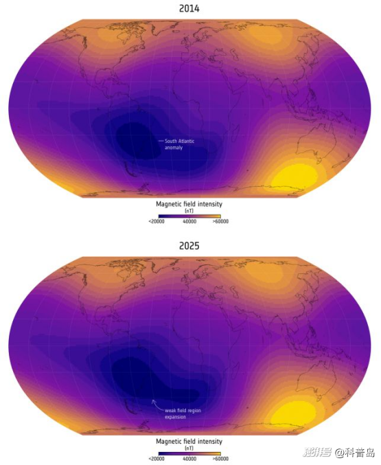 歐洲航天局(ESA)的“蜂群”(Swarm)衛(wèi)星星座一直在密切監(jiān)視著它。最新的數(shù)據(jù)顯示,自2014年以來,這個(gè)“大坑”的面積已經(jīng)擴(kuò)大了約半個(gè)歐洲大陸的大小,同時(shí)其磁場(chǎng)強(qiáng)度也在持續(xù)減弱。