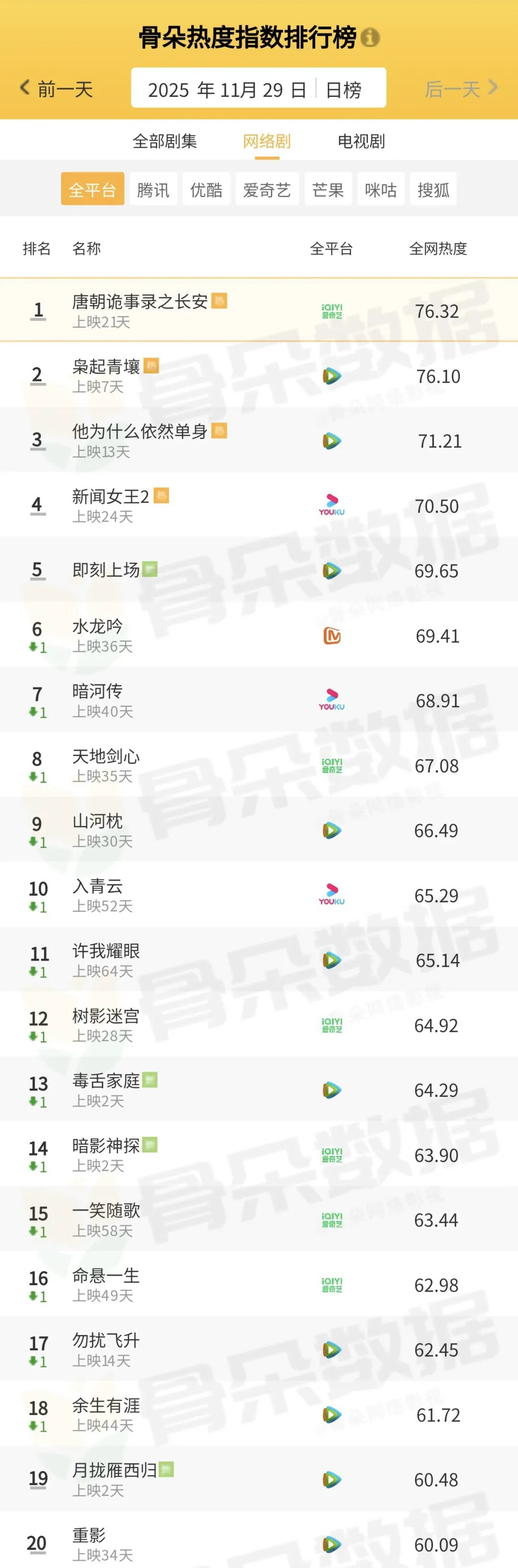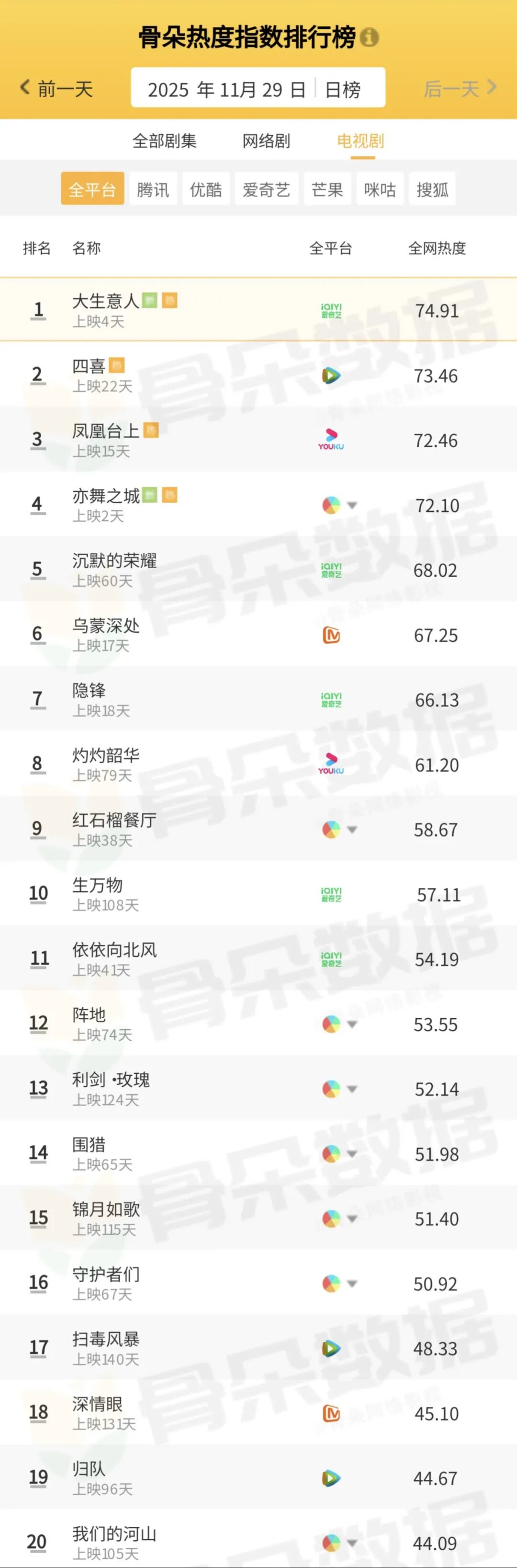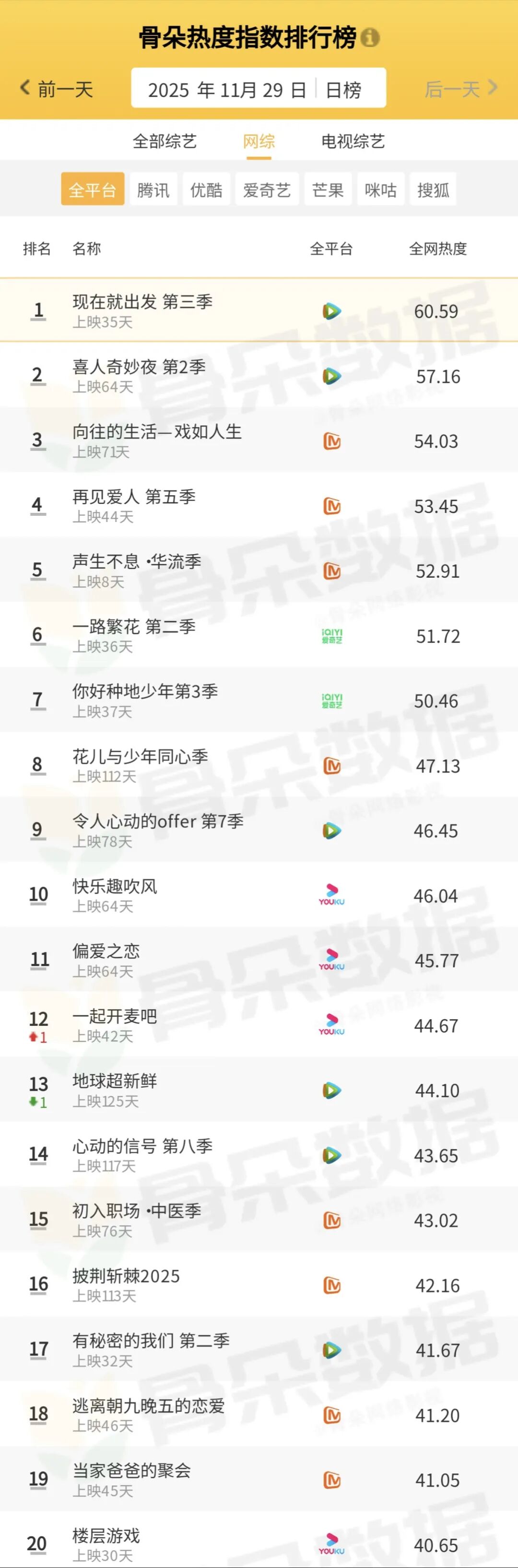骨朵榜單丨2025年11月29日劇綜熱度指數(shù)表現(xiàn)