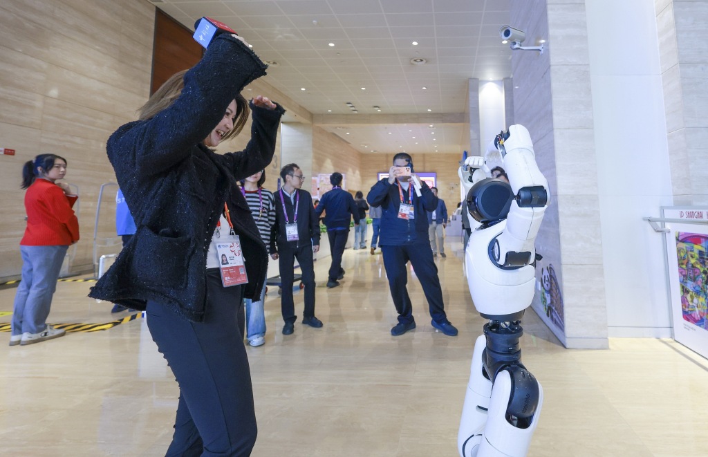 3月26日,北京,人形機器人擔(dān)任“智愿者”亮相2025中關(guān)村論壇主會場。