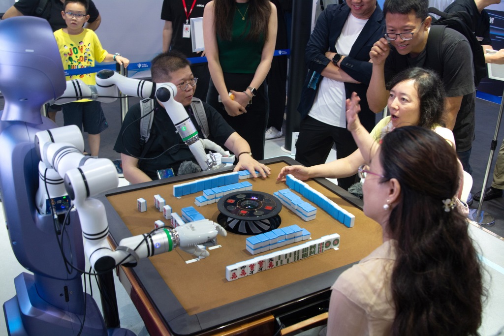 7月26日,參觀者與Psibot人形機器人在世界人工智能大會上打麻將。