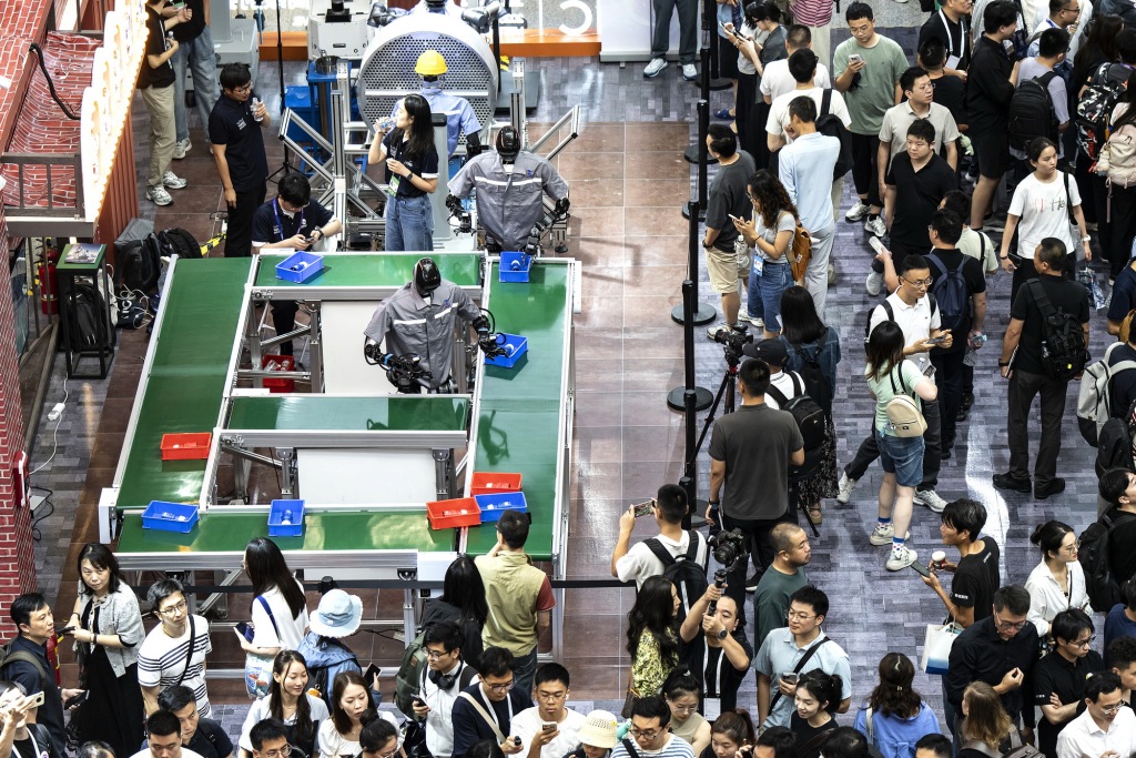 7月26日,世界人工智能大會上,多個人形機器人在裝配線上工作,引起圍觀。