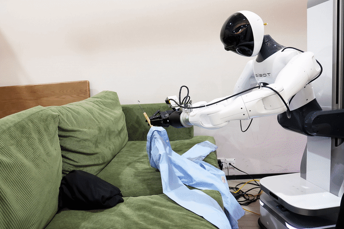 9月14日,浙江紹興,杭州灣具身智能創(chuàng)新中心的數(shù)據(jù)采集區(qū)內(nèi),人形機器人跟著技術(shù)人員學(xué)疊衣服。