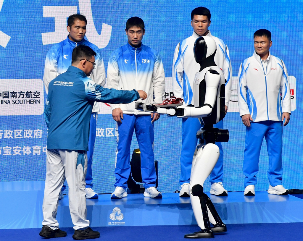 11月14日,機器人手捧獎牌亮相十五運拳擊男子63.5公斤級頒獎儀式。
