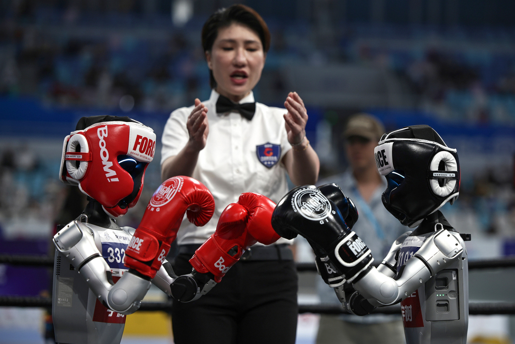 8月16日,裁判在2025世界人形機器人運動會上宣布格斗比賽開始。