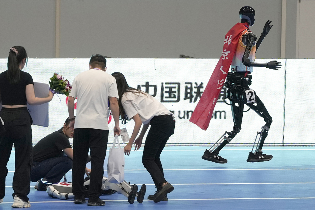 披著披風(fēng)的天工ULTRA機器人在贏得百米決賽后慶祝。