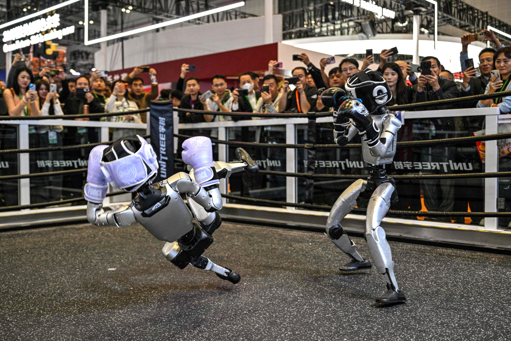 11月6日,上海,在第八屆進博會技術(shù)裝備展區(qū),宇樹科技展臺正在舉行一場人形機器人格斗賽。