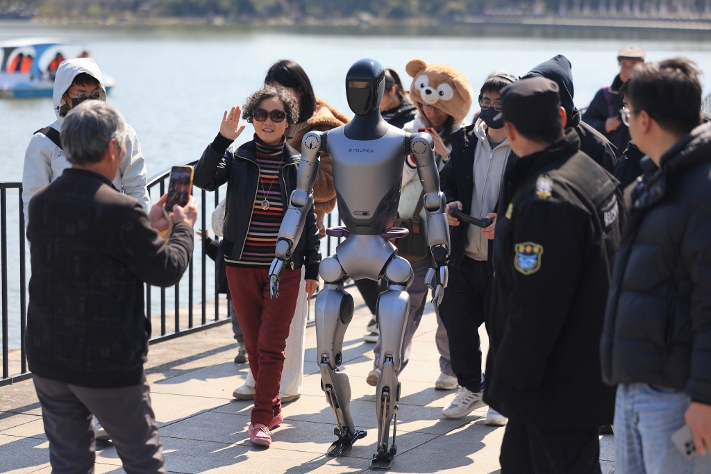 3月17日,機器人在上海世紀(jì)公園散步,吸引游客圍觀。