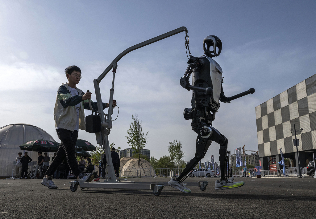 4月17日,2025北京亦莊半程馬拉松比賽前夕,一名媒體記者為人形機器人加油助威。