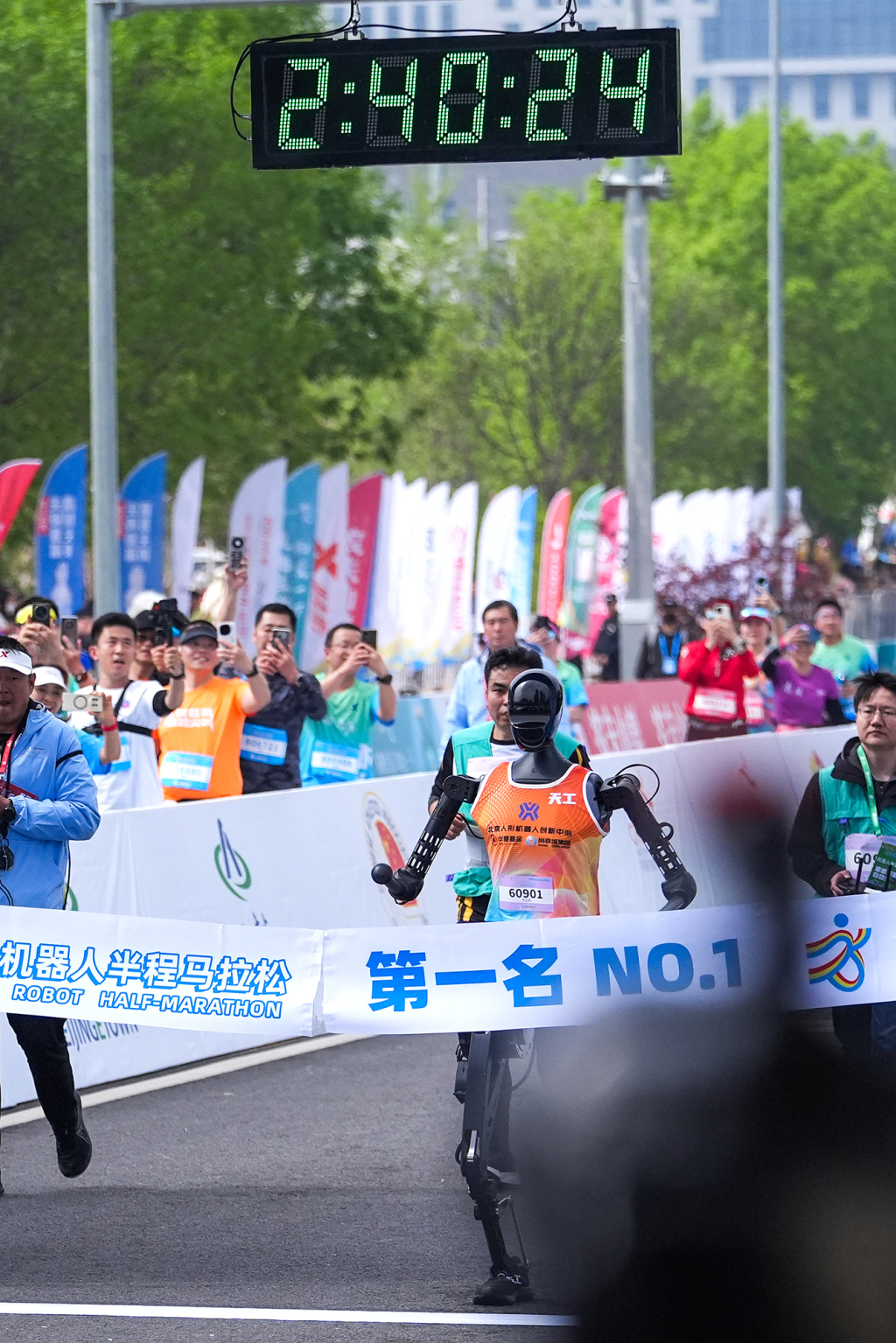 4月,“天工”Ultra以2小時40分42秒的成績第一個沖過終點,完成了全球首個人形機器人半程馬拉松。