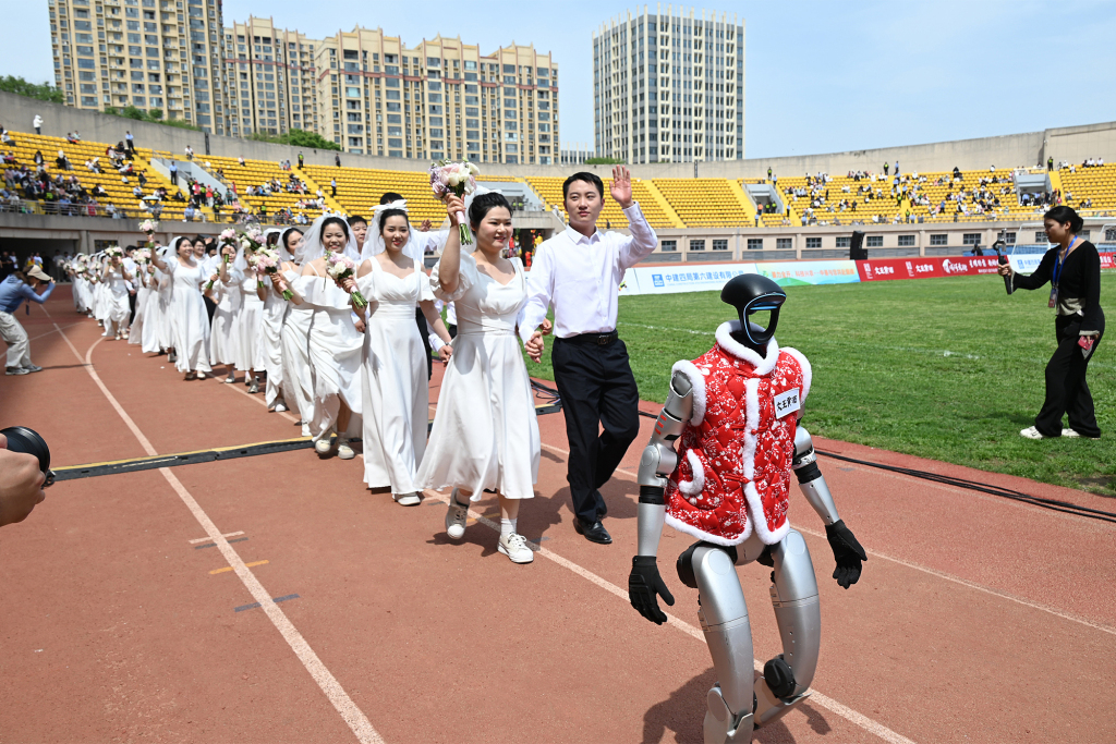 4月19日,機器人在安徽阜陽一場集體婚禮上擔(dān)任領(lǐng)隊。
