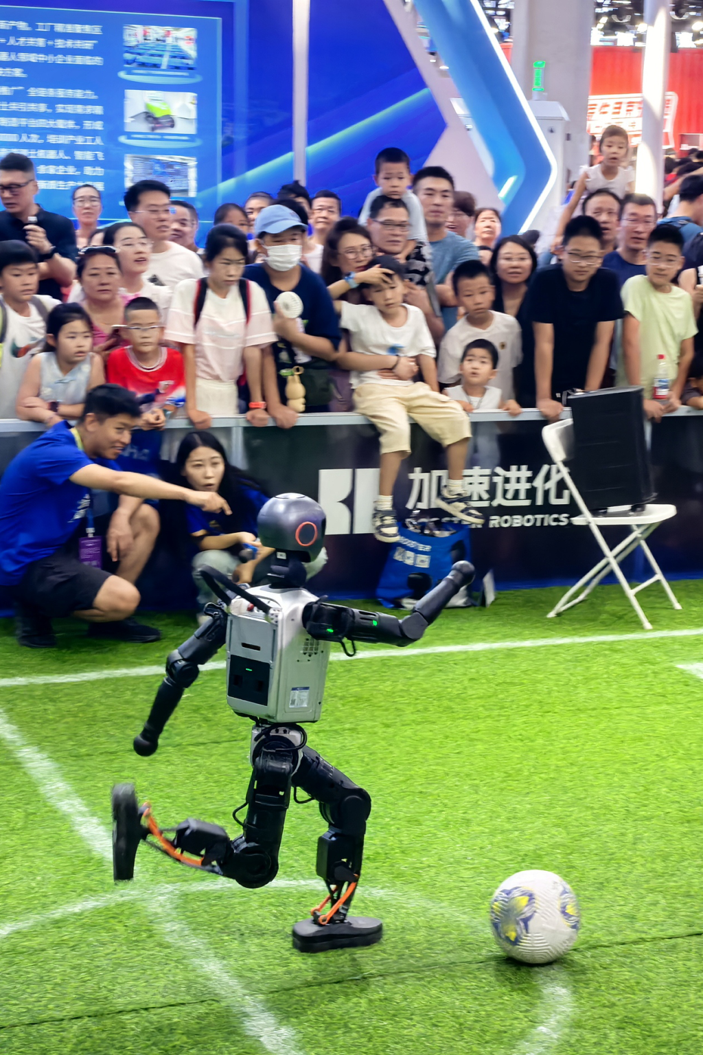 8月9日,北京,世界機器人大會上,加速進化公司的機器人踢足球場景吸引了不少觀眾注意。