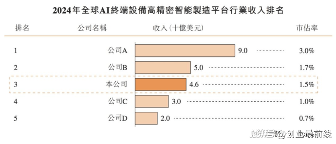 據(jù)最新的招股書披露,弗若斯特沙利文的資料顯示,以2024年收入計,領益智造在全球AI終端設備高精密功能件行業(yè)中排名第一,年收入達到22.59億美元,市占率6.7%;在全球AI終端設備高精密智能制造平臺行業(yè)排名第三,年收入46億美元,市占率1.5%。