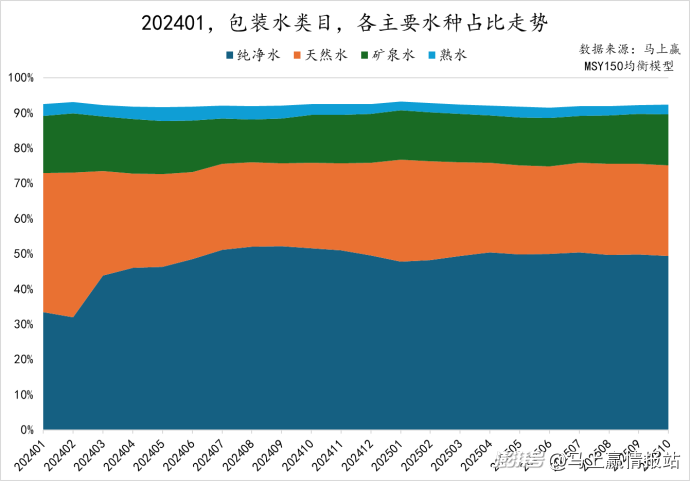 首先來看幾個(gè)主要水種在包裝水類目的占比情況變化。