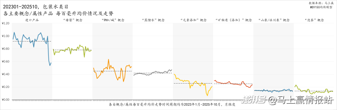 進(jìn)一步來看,不同飲用水概念/來源的價(jià)格走勢(shì)存在顯著差異。受限于運(yùn)費(fèi)、關(guān)稅等原因,進(jìn)口產(chǎn)品的價(jià)格遠(yuǎn)高于其他概念,達(dá)到了約0.9元每百毫升,但在近期出現(xiàn)了較為顯著的下滑;其次是“母嬰”概念的水產(chǎn)品,體現(xiàn)了其在市場(chǎng)中的高端定位和細(xì)分人群的附加值;“PH+/堿”概念、“蒸餾水”概念的產(chǎn)品其每百毫升均價(jià)也高于包裝水類目每百毫升均價(jià)約30%,體現(xiàn)了有益添加、不同工藝的溢價(jià)能力;“元素添加”、“礦物質(zhì)(添加)”、“山泉/冰川泉”、“泡茶”百年水產(chǎn)品則沒有太多溢價(jià),甚至部分略低于包裝水每百毫升均價(jià)。