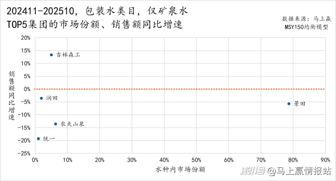 從2025年1-10月,包裝水類目TOP5集團(tuán)的市場(chǎng)變動(dòng)來看,娃哈哈雖然增長勢(shì)頭已經(jīng)放緩,但也守住了新奪下的“陣地”;農(nóng)夫山泉雖然在去年剛剛被卷入漩渦時(shí)略顯慌亂,但也靠著進(jìn)軍純凈水賽道的“綠水”產(chǎn)品,穩(wěn)住了陣腳;景田、康師傅各有各的天地,雖然也受到了類目競(jìng)爭(zhēng)加劇帶來的影響,但整體還算平穩(wěn)。