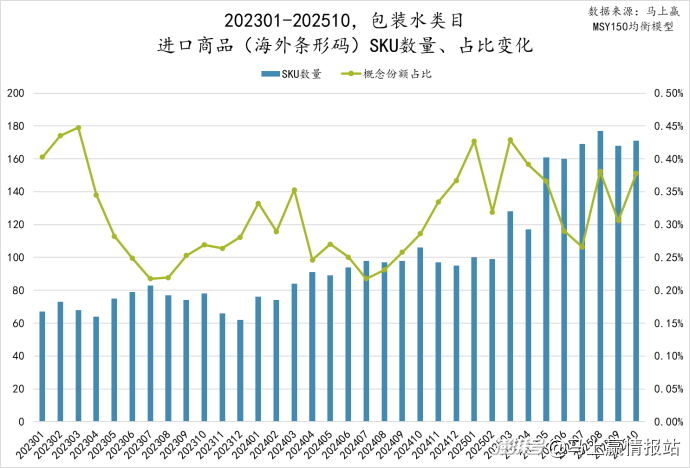 進(jìn)口商品在包裝水市場(chǎng)中的SKU數(shù)量呈現(xiàn)出上升趨勢(shì),但其概念占比一直在波動(dòng),整體變化不大,始終維持在約0.25%~0.45%之間波動(dòng)。一方面,中國消費(fèi)者在本土有更多、更好的選擇,對(duì)于“依云”、“VOSS”等傳統(tǒng)進(jìn)口高端水也在不斷的祛魅,另一方面,包裝水類目整體的價(jià)格水平走勢(shì)下,高于類目整體百毫升均價(jià)水平四至五倍,超高端定位的產(chǎn)品,也在被消費(fèi)者不斷質(zhì)疑產(chǎn)品本身是否能夠支撐其高昂的價(jià)格。