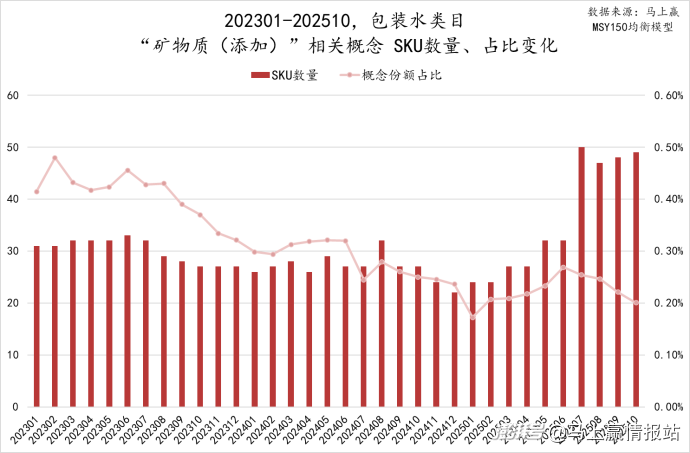 從發(fā)展來看,礦物質(zhì)添加概念的飲用水SKU數(shù)量整體穩(wěn)定,但在近幾個(gè)月有較為明顯的上升。但其占比卻出現(xiàn)了下降,在過去兩年中占比近乎腰斬。結(jié)合礦物質(zhì)概念的每百毫升單價(jià)也出現(xiàn)了下降趨勢(shì),這可能與市場(chǎng)競(jìng)爭(zhēng)加劇、消費(fèi)者有更好的產(chǎn)品選擇等有一定的相關(guān)性。礦物質(zhì)水本身概念也較為陳舊,隨著消費(fèi)者對(duì)天然水源和水質(zhì)的關(guān)注度增加,礦泉水等其他類型產(chǎn)品的成長也會(huì)削弱僅僅是礦物質(zhì)概念的產(chǎn)品,這可能導(dǎo)致了該類產(chǎn)品市場(chǎng)份額的下滑。