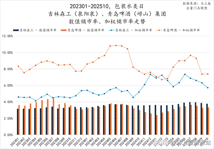 從鋪市率的角度看,青島啤酒的數(shù)值鋪市率波動(dòng)較為明顯,但整體有一定的下降趨勢(shì),相比來說吉林森工的數(shù)值鋪市率則較為穩(wěn)定,且呈現(xiàn)一定的輕微上升趨勢(shì);加權(quán)鋪市率上,吉林森工雖然整體低于青島啤酒,但兩者的差距正在不斷減小,甚至在2025年年初時(shí)有個(gè)別月出現(xiàn)了接近于反超。