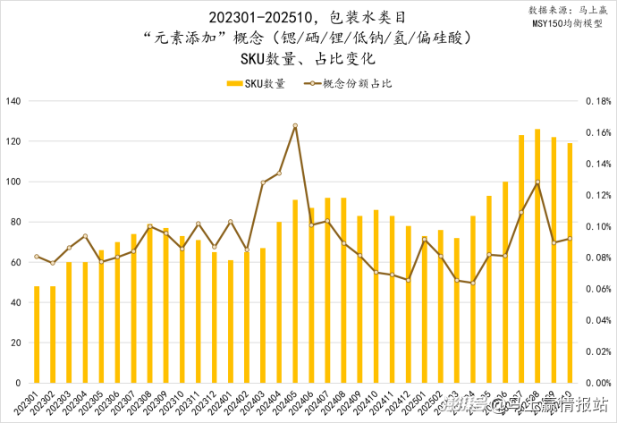 元素添加概念相關(guān)的產(chǎn)品,SKU數(shù)量呈現(xiàn)出較為明顯的上升趨勢(shì),占比亦有略微上升的趨勢(shì)。去年農(nóng)夫山泉?jiǎng)?chuàng)始人在媒體活動(dòng)上,以自身選擇小小的帶火了一把“鋰水”,究其根本則是消費(fèi)者對(duì)于針對(duì)性的功能性、功效型添加,依然有著相信與認(rèn)可,隨著功效化功能化產(chǎn)品的浪潮,未來該類型產(chǎn)品或?qū)⒂瓉砀蟮陌l(fā)展。