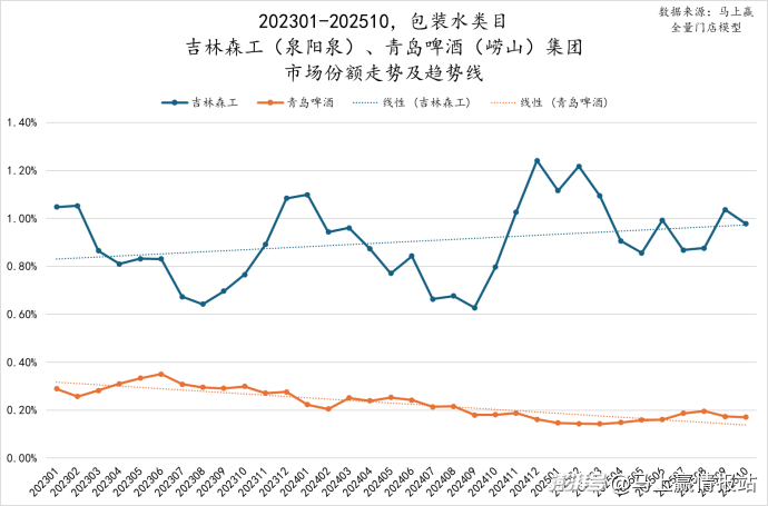 從包裝水類目?jī)?nèi),兩個(gè)集團(tuán)的市場(chǎng)份額來看,可以看到,吉林森工在市場(chǎng)份額上整體呈現(xiàn)上漲趨勢(shì),且其市場(chǎng)份額有著較明顯的季節(jié)波動(dòng),或許也與其所在的強(qiáng)勢(shì)區(qū)域的消費(fèi)者消費(fèi)習(xí)慣、消費(fèi)偏好有較強(qiáng)的相關(guān)性;相比來說,青島啤酒集團(tuán)在包裝水類目中的市場(chǎng)份額則不甚理想,從202301至今,市場(chǎng)份額基本整體呈現(xiàn)下降趨勢(shì)。
