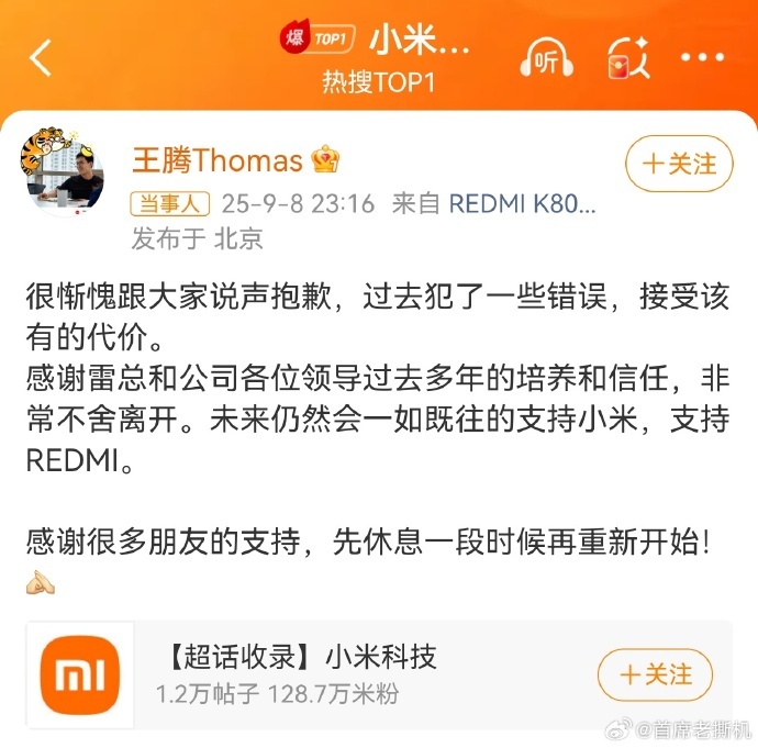 幾個(gè)月前,小米公司中國(guó)區(qū)市場(chǎng)部總經(jīng)理王騰因?yàn)樾姑鼙婚_(kāi)除。