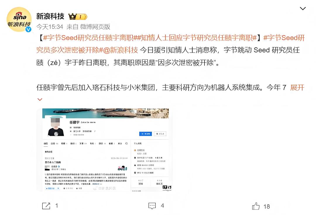日前,據(jù)新浪和澎湃新聞等多家媒體報(bào)道,字節(jié)跳動(dòng)大模型團(tuán)隊(duì)(Seed)研究員任某某已于11月11日離職,原因是“因多次泄密被開(kāi)除”。