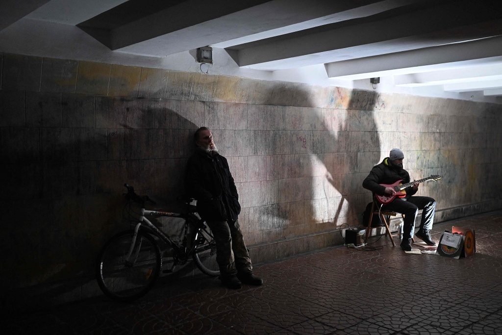 當(dāng)?shù)貢r間2025年11月20日,烏克蘭基輔,一名男子在停電的地下通道里聽街頭音樂人彈吉他。視覺中國 圖