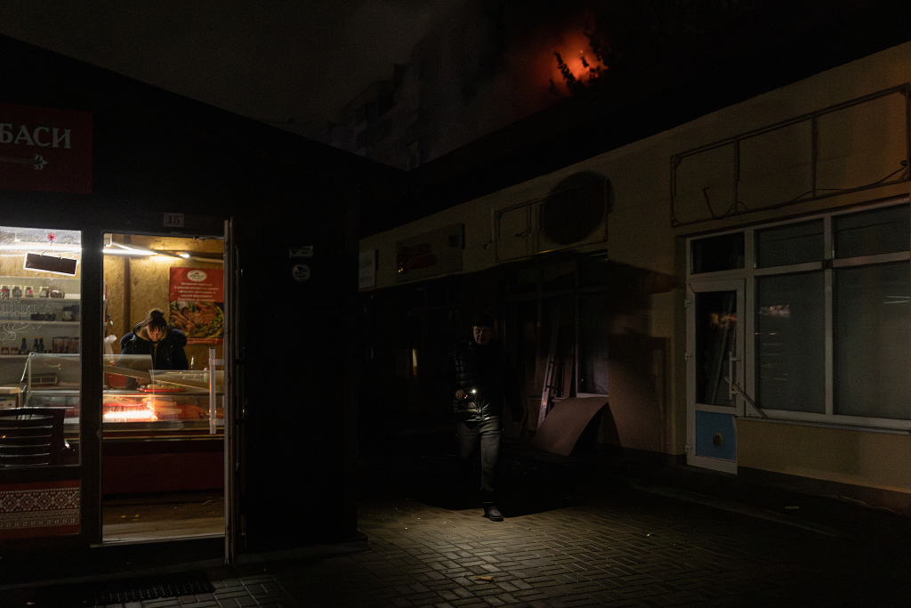 當(dāng)?shù)貢r間2025年11月30日,烏克蘭基輔,在俄羅斯無人機襲擊后,全城斷電,居民穿過黑暗的街道。視覺中國 圖