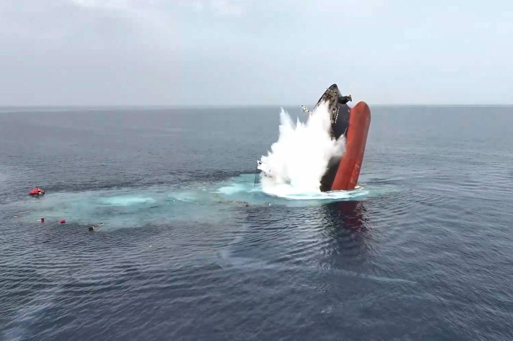 2025年7月8日,也門西部荷臺達省紅海海域,受到胡塞武裝襲擊的貨船“ETERNITY C”號,船體受損后正在下沉。視覺中國 圖