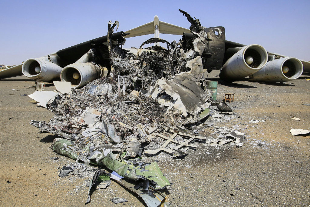 當(dāng)?shù)貢r間2025年4月17日,蘇丹喀土穆國際機場,一架被炸毀飛機。蘇丹快速支援部隊當(dāng)天對該國西部北達爾富爾州首府法希爾市進行炮擊,造成62名平民死亡、75人受傷。視覺中國 圖