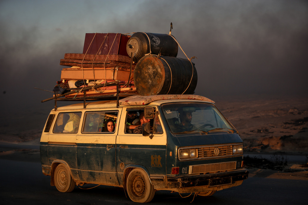 當(dāng)?shù)貢r間2025年9月3日,加沙地帶,民眾帶著有限的隨身物品,乘坐車輛、馬車或步行,經(jīng)拉希德街向加沙中部遷移。此前以色列對加沙北部的襲擊加劇,迫使他們逃離家園。視覺中國 圖