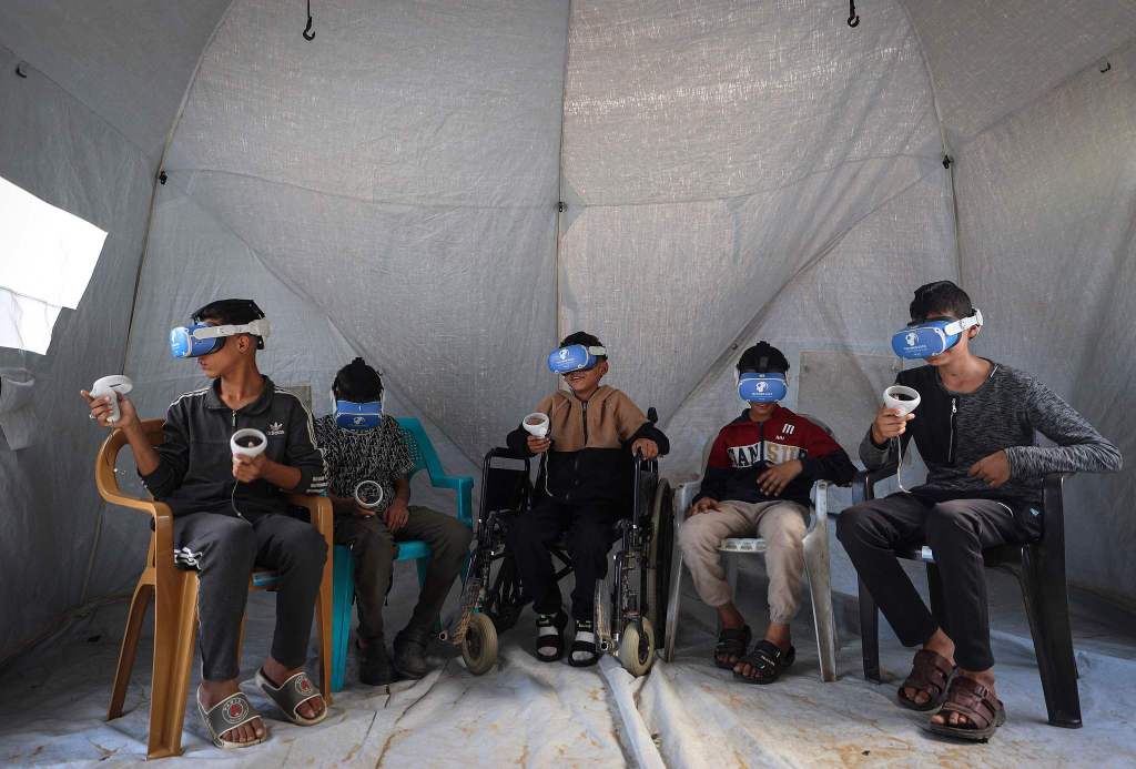 當(dāng)?shù)貢r間2025年11月30日,加沙地帶扎瓦伊達市,兒童通過虛擬現(xiàn)實技術(shù)緩解戰(zhàn)爭創(chuàng)傷。這些療程是專門為受創(chuàng)傷兒童設(shè)計的,考慮他們的身心狀況,并幫助他們重建對世界的積極認(rèn)知。視覺中國 圖